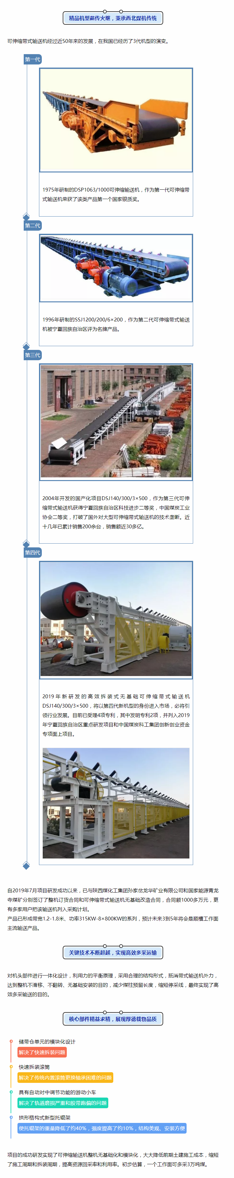 2019年9月25日,国内首套高效拆装式无基础可伸缩带式输送机在中国煤炭科工集团上海有限公司宁夏天地西北煤机有限公司(以下简称西北煤机)问世,现已完成安装调试,即将发往陕西煤化工集团孙家岔龙华矿业有限公司20111顺槽工作面。