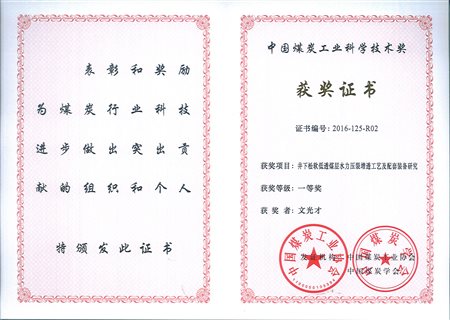 (6)2016年“井下松软低透煤层水力压裂增透工艺及配套装备研究”获中国煤炭工业科学技术奖一等奖;